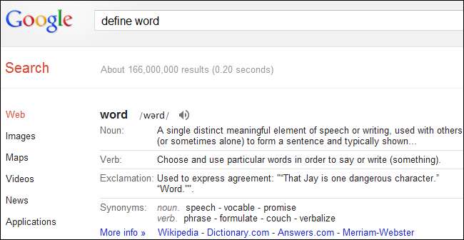 Voit tarkastella sanan sanakirjan määritelmää hakusanalla määritä sana - Google näyttää sanan määritelmän sekä painikkeen, jota napsauttamalla kuulet sanan lausuvan ääneen.
