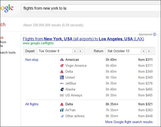 Etsi käytettävissä olevia lentoja hakemalla lennot kaupungista kaupunkiin . Google näyttää sinulle luettelon käytettävissä olevista lennoista sekä niiden hinnat, kestot ja lentoyhtiöt - voit antaa päivämäärät ja etsiä lennot suoraan hakusivulta.