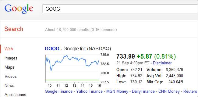 Tarkastele osaketta, mukaan lukien sen hinta ja kaavio hintahistoriasta, etsimällä mitä tahansa osakesymbolia Googlessa.
