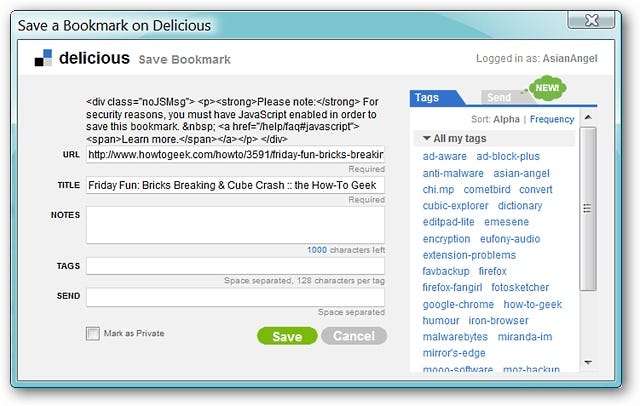 Voit tallentaa verkkosivun herkullisiin kirjanmerkkeihisi napsauttamalla SimpleDelicious-valikossa kohtaa Kirjanmerkki tämä sivu. Näet seuraavan ikkunan avautuvan, kun URL-osoite ja verkkosivusto on jo täytetty. Sinun tarvitsee vain lisätä kaikki haluamasi tiedot ja napsauttaa "Tallenna". Jos haluat nähdä uuden kirjanmerkin SimpleDelicious-valikossa, napsauta "Päivitä kirjanmerkit".