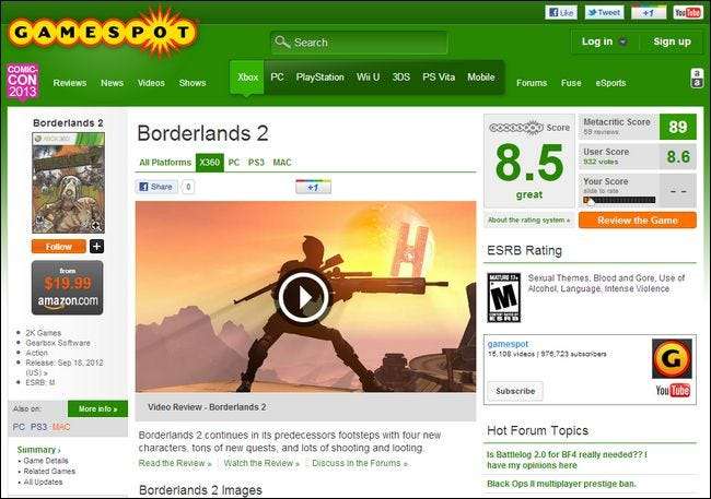 Huolimatta siitä, kuinka hyödyllisiä ne ovat yleisten peliarvostelujen ja sijoitusten kannalta, IGN: n ja GameSpotin kaltaiset verkkosivustot eivät auta paljoakaan täällä. Katsotaanpa suositun pelin arvosteluja, Borderlands 2 , molemmilla verkkosivustoilla.