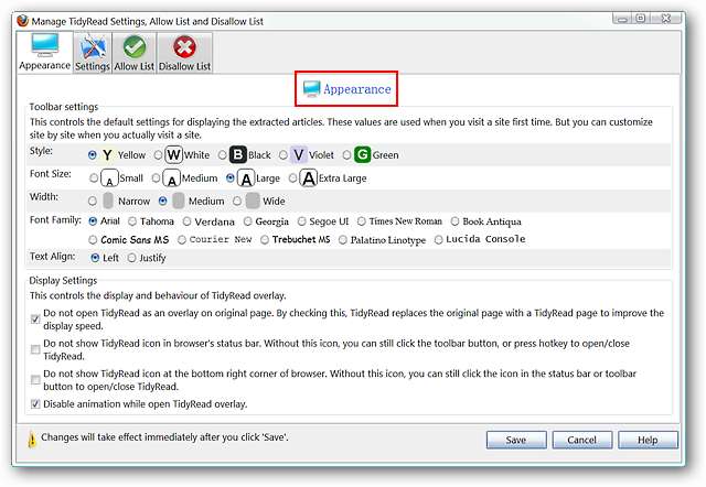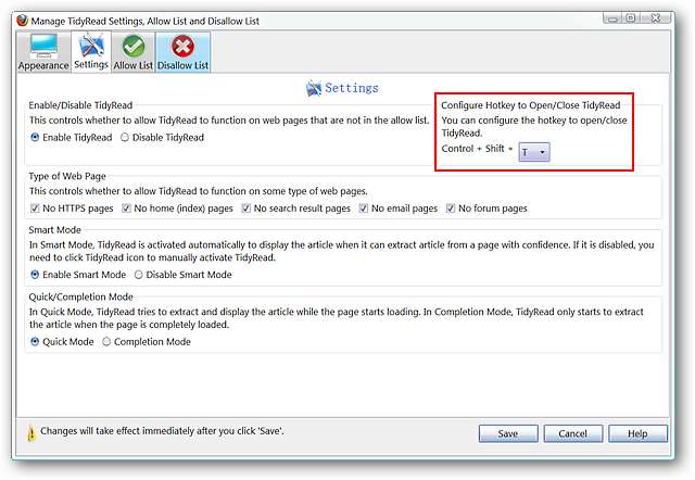 Voit myös säätää niiden verkkosivujen tyyppejä, joissa TidyRead on aktiivinen, pikanäppäimiä ja toimintatiloja.