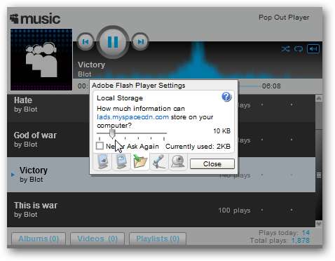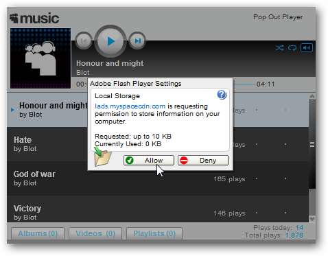 Tässä esimerkissä asetin paikalliselle tallennustilalle Ei mitään, ja nyt kun menen MySpaceen ja yritän toistaa kappaletta, se pyytää lupaa tietojen tallentamiseen.