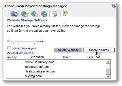 Poista olemassa olevat Flash-evästeet napsauttamalla Verkkosivuston tallennusasetukset -välilehteä (sijaitsee aivan näytön oikealla puolella) ja napsauta Poista kaikki sivustot -painiketta.
