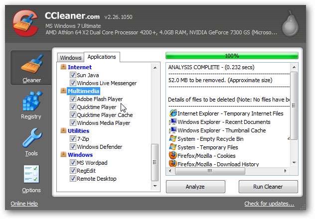 Jos käytät IE: tä tai muuta selainta, toinen hyvä vaihtoehto LSO: iden poistamiseksi on CCleaner. Oletuksena Flash-evästeet on asetettu poistettaviksi, mutta sinun kannattaa tarkistaa asia varmistaaksesi. Napsauta Puhdistaja-osiossa Sovellukset-välilehteä, vieritä kohtaan Multimedia ja varmista, että Adobe Flash Player on valittu.