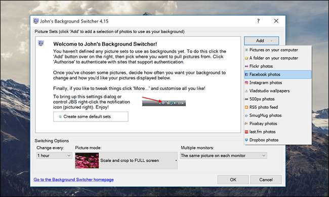 Jos haluat paljon enemmän joustavuutta kuin mikään yllä olevista työkaluista, tarkista John's Wallpaper Switcher , joka voi muokkaa taustakuvasi kuvahaulla, RSS-syötteillä ja muulla . Voit valita useita lähteitä kiertääksesi, mikä tekee tästä erittäin joustavan työkalun haluamillesi kuville. Työkalu toimii Windows- ja macOS-tietokoneissa, vaikka vain Windows-versio on ilmainen.