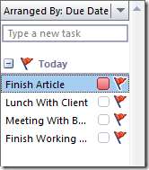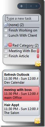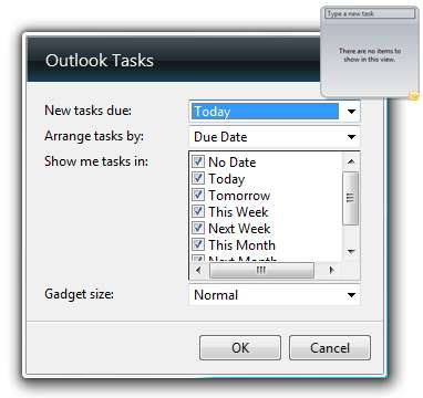 Ensimmäinen uloskirjautuva on Outlookin tehtävät . Tämä kätevä sovellus näyttää ajoitetut tehtävät Outlook 2007: n Tehtäväpalkissa. Outlookissa jo ajoitetut tehtävät eivät näy, mutta voit myös lisätä uusia tehtäviä kirjoittamalla ne Gadgetiin. Tämä päivittää tehtäväluettelon myös Outlookissa. Kun suoritat tehtäviä, tarkista ne vain Gadget-luettelosta.