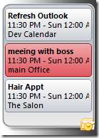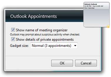 Toinen gadget, jota voimme tarkastella, on Outlook Tulevat tapaamiset . Tämän avulla voit nähdä tulevat tapaamiset Outlook-kalenteristasi. Voit tehdä muutamia muutoksia valitsemalla näytettävien tapaamisten määrän. Enimmäismäärä on viisi.