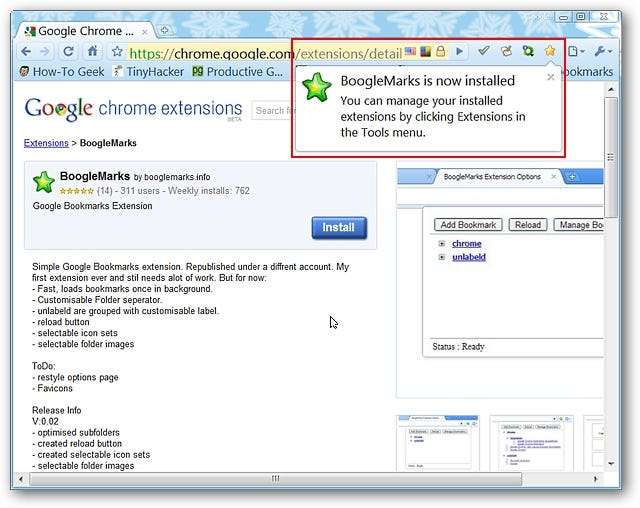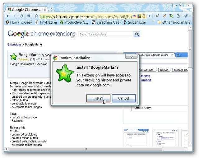 Kun olet aloittanut asennuksen, näet vahvistusviesti-ikkunan. Sinun on napsautettava Asenna, jotta voit viimeistellä BoogleMarksin Chromeen.
