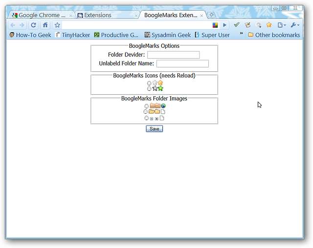 Nämä ovat käytettävissä olevat vaihtoehdot BoogleMarksille. Voit valita "Kansionjakajan", mitä nimeä käytetään nimittämättömiin kirjanmerkkikansioihin, "BoogleMarks-kuvakuvat" ja "BoogleMarks-kansio-kuvat".