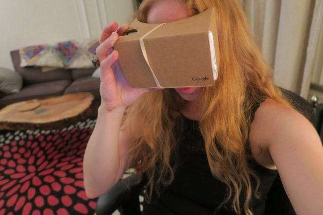Näiden ongelmien takia Google Cardboardia ei ole suunniteltu käytettäväksi päähihnan kanssa, joka kiinnittää sen päähän. Se on suunniteltu käytettäväksi kuten View-Master - pidä sitä silmälläsi kädellä tai kahdella ja katso ympärillesi. Mutta päähihnan puute tekee siitä vähemmän mukaansatempaavan, kun liikutat päätäsi ja joudut käyttämään käsiäsi tuodaksesi kuulokkeen mukaasi.
