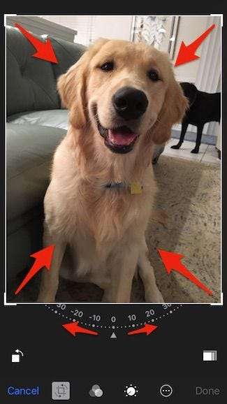 Kun avaat valokuvan muokattavaksi, näet neljä hallintalaitetta: kiertäminen / rajaus, suodattimet, värisäädöt ja paljon muuta.