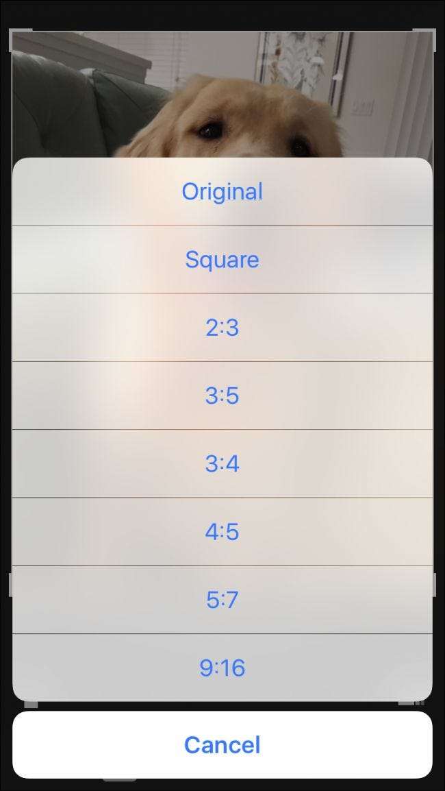Jos haluat rajoittaa rajauksen tiettyyn kuvasuhteeseen, napauta painiketta (kuva yllä oikeassa alakulmassa), ja Valokuvat näyttää sinulle luettelon.