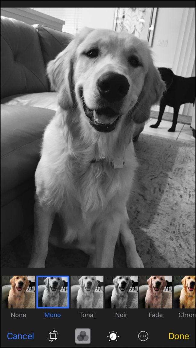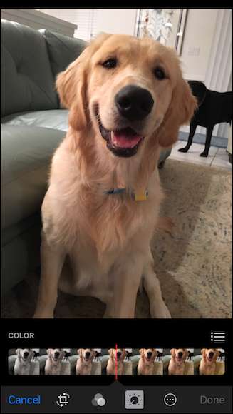 Yksinkertaisten rajaus- ja kiertosäätimien lisäksi valokuvissa on myös suodattimen esiasetukset, joita voit kokeilla. Tämä on täysin tuhoamatonta, joten jos mikään niistä ei ole houkutteleva, voit yksinkertaisesti palata alkuperäiseen napauttamalla "Peruuta".