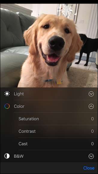 Tässä ovat alavaihtoehdot, jotka näemme Väri-valitsimella. Näiden napauttaminen antaa sinun tehdä vielä tarkempia säätöjä kuvan kylläisyydelle, kontrastille tai näyttelijälle. teet samalla tavalla valoa ja mustavalkoa.