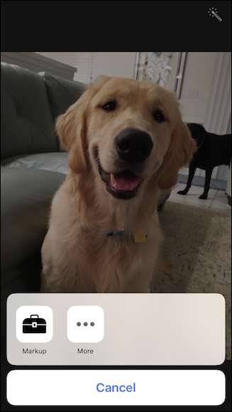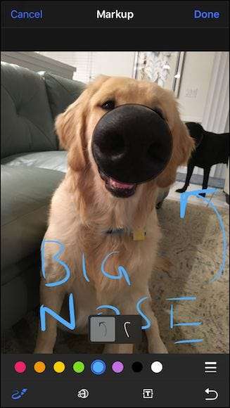 Mutta odota, emme ole vielä valmiita. Valokuvat antaa sinulle myös mahdollisuuden merkitä valokuvasi piirroksilla, tekstillä ja suurennuksilla. Napauta Lisää-painiketta (viimeinen painike oikealla) ja sitten "Merkintä".