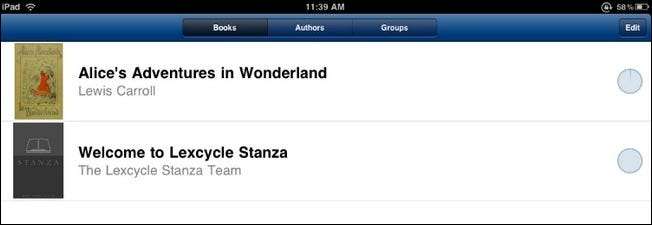 Asenna Stanza iPadiin ja avaa se. Näet kaksi sovelluksen mukana tullutta kirjaa: Alice's Adventures in Wonderland ja tervetuliaisopas Stanza-tiimiltä. Lukulista on hieman harva; ladataan se henkilökohtaisesta kokoelmastamme.
