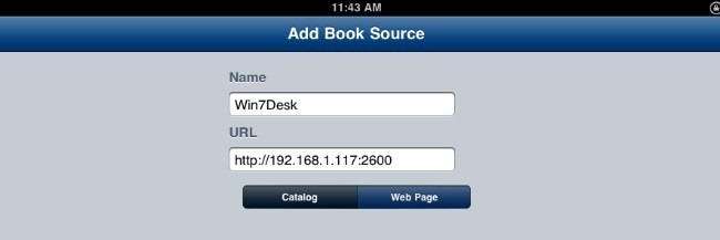 Napsauta oikeassa yläkulmassa olevaa + -merkkiä. Syötetään ensin paikalliset tiedot, kun olet talossasi tai takapihallasi, haluat muodostaa yhteyden suoraan Wi-Fi-verkkoon sen sijaan, että ohjaat kirjojen lataukset suuremman (ja hitaamman) Internetin kautta. Kirjoita kirjojasi isännöivän paikallisen verkon tietokoneen nimi ja URL-osoite. Meidän tapauksessamme syötämme Win7Desk muistuttamaan meitä siitä, millä koneella kirjat ovat, ja sisäisen IP-osoitteen, jota seuraa portin numero: