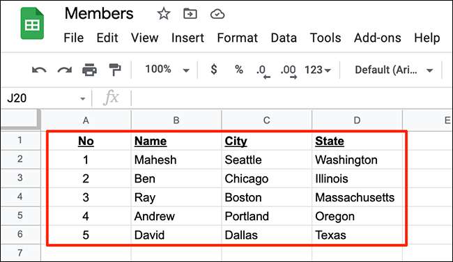 Seuraavaksi valitse alue, joka sisältää syötettyjä tietoja omassa Sheets taulukkoon. Käyttää hiirtä tai näppäimistön nuolinäppäimillä tehdä tämän valinnan.