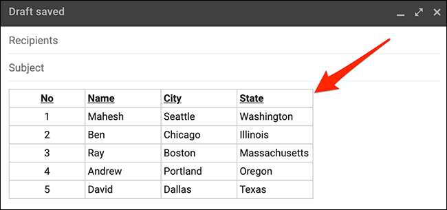 Ongelman voi Alla käyttää Google Sheets luoda taulukon. Voit tehdä taulukon Sheets, taulukon kopiointi sieltä, ja liitä se sähköpostiviestiin Gmailissa. Gmail säilyttää alkuperäisen muotoilua pöydän, mikä tarkoittaa, että taulukko näyttää samalta onko se levyinä tai sähköposteja Gmailissa.