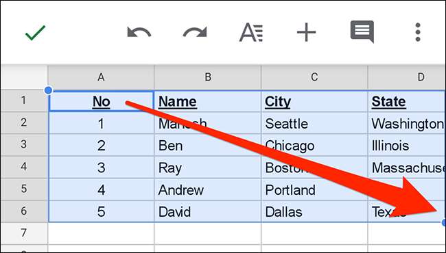 Jos luot uuden taulukon, syötä tiedot oman taulukon laskentataulukkoon auki puhelimen näytöllä. Sitten alkaa vetää pois vasemmassa yläkulmassa oman pöydän koko aina oikeassa alakulmassa. Tämä valitsee pöydän taulukossa.