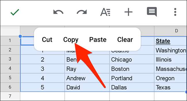 Nyt kopioi valitun alueen leikepöydälle. Tämä onnistuu klikkaamalla Muokkaa & gt; Kopioi Sheets’ valikkoriviltä. Vaihtoehtoisesti paina Ctrl + C Windows-tai Command + C Mac kopioida taulukon.