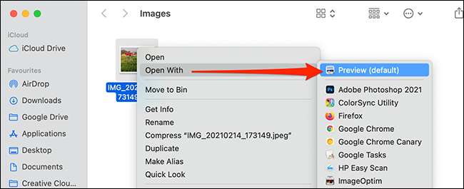 Finderin, avaa kansio, joka sisältää kuvan, jonka haluat lisätä PDF. Hiiren kakkospainikkeella kuvaa ja valitse Avaa & gt; Esikatsella valikossa.