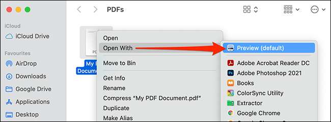 Seuraavaksi etsi PDF, jonka haluat liittää kuvan Finderin. Hiiren kakkospainikkeella PDF ja valitse Avaa & gt; Esikatsella valikossa.