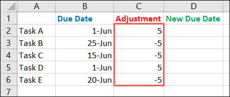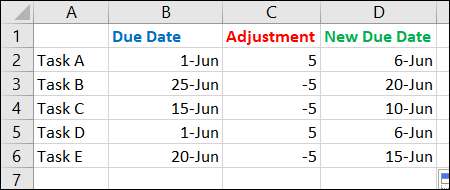 Olettaen, että sinulla on alkuperäinen päivämäärät työtä, anna päivien määrä, jonka haluat lisätä tai vähentää päivämääristä lähtien kyseisessä säätö sarakkeeseen. Anna positiivinen luku lisätä päivämäärän tai negatiivisen numeron vähentävät sitä.