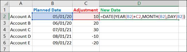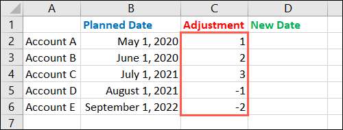 Joten varmista, että sinulla on kolme saraketta alkuperäiselle päivämäärät, määrä kuukauden säädöt, ja uudet päivämäärät, ja on valmis vahvistamaan, että päivämäärä sarakkeet on muotoiltu sellaisiksi.