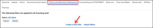 Napsauta rataskuvaketta pääset Asetukset ja valitse ”Näytä kaikki asetukset” sivupalkissa. Valitse Suodattimet ja Estettyjen osoitteiden välilehti ja klikkaa ”Luo uusi suodatin.”