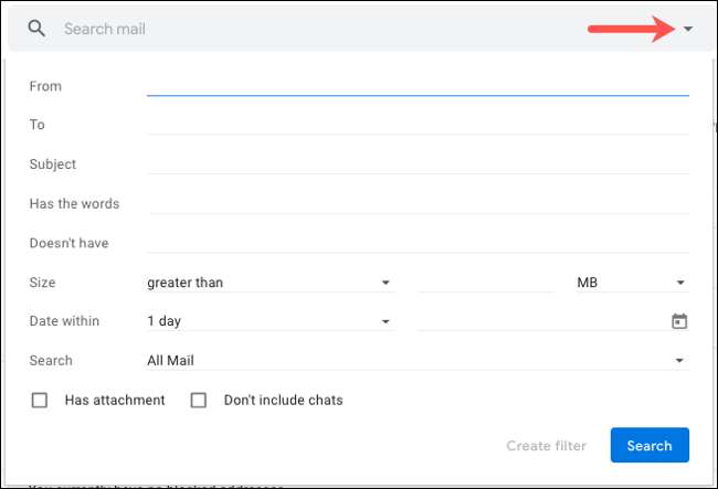 Vielä toinen menetelmä on käyttää hakukentän yläreunassa Gmailin. Napsauta nuolta oikealla puolella hakukenttään. Tässä yhdistyy etsivät sähköpostitse luonut suodattimen.
