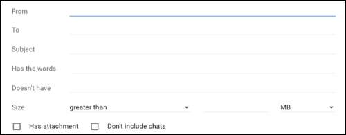 Näet yleisimpiä aloilla, joilla voit kirjoittaa kriteerit, jotka haluat Gmailin etsiä. Näitä ovat Lähettäjä, Vastaanottaja, Aihe, Sisältää sanat, ei ole sanoja, ja koko. Sinulla on myös valintaruudut sähköpostiviestejä, jotka sisältävät liitetiedostoja ja onko haluat sisällyttää keskustelut.