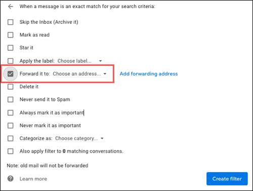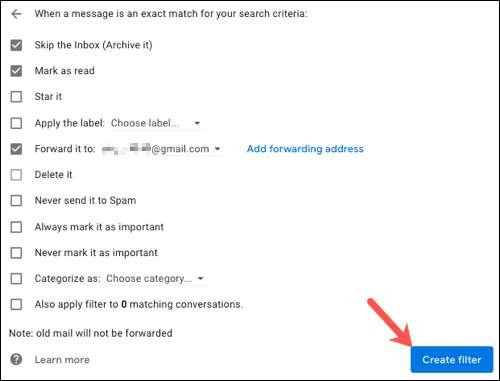 Voit myös valita useampia toimia, jos haluat. Esimerkiksi ehkä haluat sähköpostin merkitty luetuksi, lähetetään arkistoon, tai poistaa. Ruudut kaikki toimet, jotka haluat lisäksi sovelletaan huolinta. Kun olet valmis, klikkaa ”Luo suodatin.”