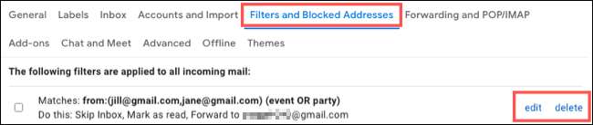 Voit muokata tai poistaa suodattimen, jonka luot Gmailissa tahansa. Napsauta rataskuvaketta pääset Asetukset ja valitse ”Näytä kaikki asetukset” sivupalkissa. Valitse Suodattimet ja Estettyjen osoitteiden välilehteä näet luettelon nykyinen suodattimia.