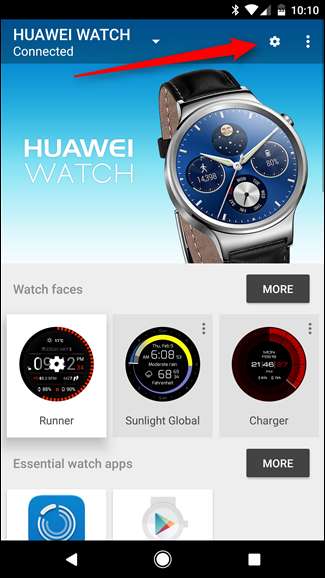 Ensinnäkin, hyppää Android Wear -sovellus . Napauta Wear-päänäytössä oikeassa yläkulmassa olevaa hammaskuvaketta.