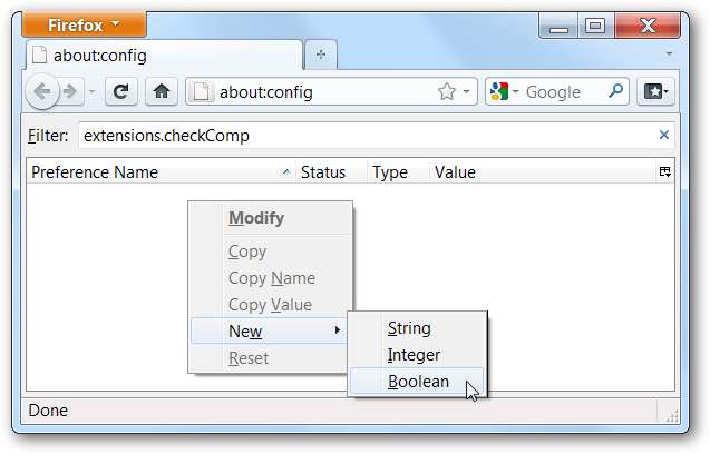 Avaa about: config -sivu ja napsauta hiiren kakkospainikkeella mitä tahansa kohtaa ja valitse Uusi -> Totuusarvo.
