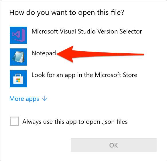 Windows kysyy, mitä sovellus haluat avata asetustiedoston. Voit valita luettelossa minkä tahansa koodin (tai tavallisen tekstin) editorin, mutta pidämme kiinni muistioon yksinkertaisuuden vuoksi. Napsauta luettelossa olevaa "Notepadia" ja paina "OK".