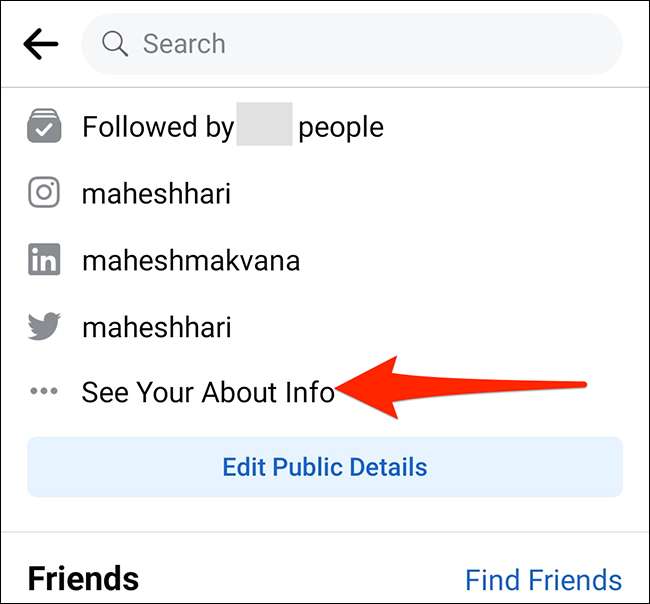 Siirry alaspäin profiilisi näytön ja yläpuolelle kaverilistallasi napauttamalla ”Näe Tietoja Info” vaihtoehto.