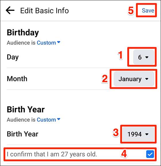 Kun olet kirjoittanut uuden syntymäpäivä vaihtoehtoja, aktivoi ”Vakuutan, että olen N vuotias” (jossa N on ikäsi) vaihtoehto. Sitten klikkaa ”Save”.