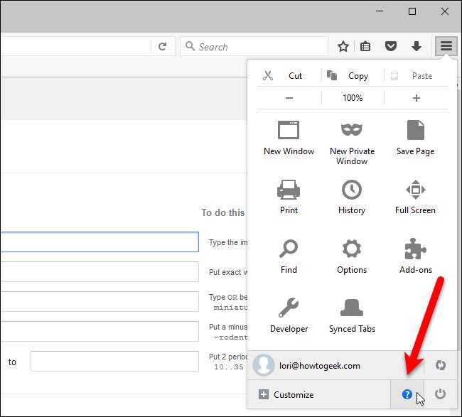 Jos et halua Firefoxin päivittyvän automaattisesti juuri nyt, voit tarkistaa vianmääritystiedot -sivulta, onko Firefox 32- tai 64-bittinen. Voit tehdä tämän napsauttamalla Firefox-valikkoa ikkunan oikeassa yläkulmassa ja napsauttamalla valikon alaosassa olevaa Ohje-kuvaketta.