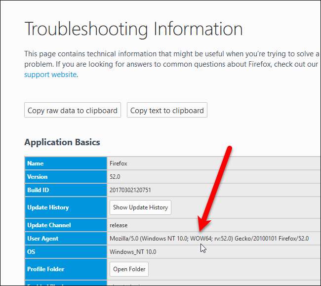 Vianmääritystiedot -sivu näkyy uudella välilehdellä. Katso Sovelluksen perusteet -kohdasta ”User Agent”. Jos siinä lukee "WOW64", käytät Firefoxin 32-bittistä versiota.