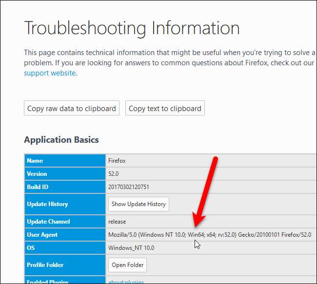 Jos Vianmääritystiedot-sivun User Agent -osiossa ei ole sanaa "WOW64" tai "Win64", olet käynnissä 32-bittinen Windows-versio , etkä voi käyttää Firefoxin 64-bittistä versiota.