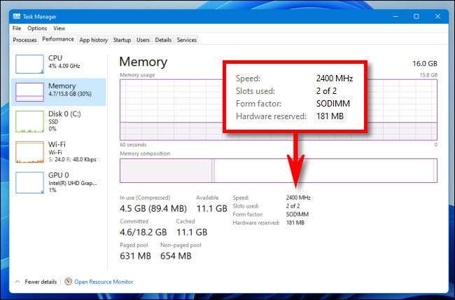 Jos haluat nähdä asennetun muistin nopeuden ja tyypin, katso kohti tehtävänhallinnan "Memory" -näytön pohjakeskusta. Siellä löydät lyhyen luettelon, joka kertoo nopeus ja muoto tekijä ja kuinka monta fyysistä RAM-aukkoa se käyttää.