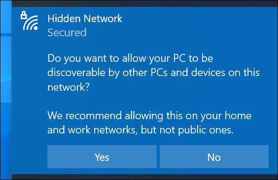 ”Piilotettu Network” -osiossa kysyy nyt, jos haluat tehdä tietokoneen löydettävissä piilotettu Wi-Fi-verkon. Näet, että Microsoft suosittelee klikkaa ”Kyllä”, jos olet kotiverkossa. Jos olet julkisessa verkossa (kuten kahviloissa), klikkaa ”Ei” vaihtoehto.