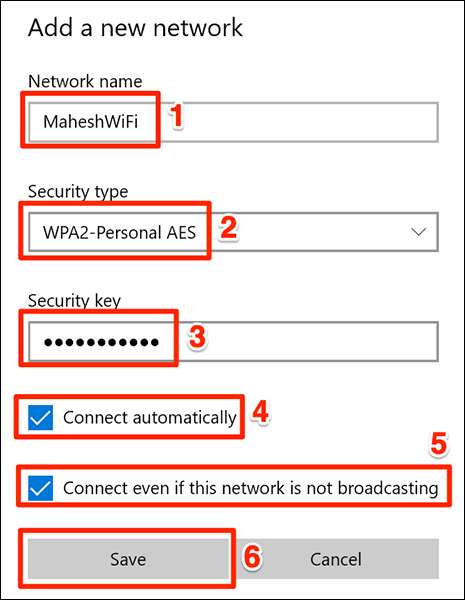 Tältä -ikkunassa ”verkon nimi” -kenttään ja kirjoita Wi-Fi-verkon nimi (SSID). Valitse ”Security Type” pudotusvalikosta ja valitse vaihtoehto. Jos et ole varma, mitä valita, valitse ” WPA2-Personal AES ”Jonka pitäisi toimia useimmissa verkoissa.