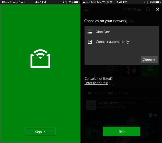 Kirjaudu SmartGlassiin samalla Microsoft-tilillä, jolla kirjauduit Xboxiin. Kun olet kirjautunut sisään, sovelluksen tulisi automaattisesti löytää Xbox One, olettaen, että laitteesi ja Xbox One ovat samassa verkossa. Napauta Xbox Onea ja napauta "Yhdistä" muodostaaksesi yhteyden konsoliin. Jätä Yhdistä automaattisesti -valintaruutu käytössä, ja sovellus muodostaa yhteyden automaattisesti Xbox Oneen tulevaisuudessa.