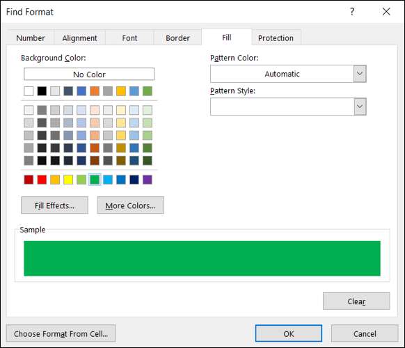 tunnetut muotoilut : Jos tiedät täsmälleen oikeassa muodossa käytit värilliset solut, esimerkiksi tietyn vihreä täyttää, klikkaa ”Format”. Käytä sitten Font, Border ja Täytä välilehdet Etsi Muoto ja valitsee värin muoto ja klikkaa ”OK”.