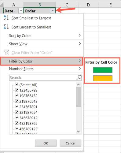 Tämä tarkkuudella suodattimen painike (nuoli) vierekkäin sarakkeen otsikkoa. Napsauta yksi sarakkeen värilliset solut haluat laskea ja siirtää kursori ”Lajittele värin.” Näet värejä käytät pop-out valikosta, joten valitse väri haluat laskea.
