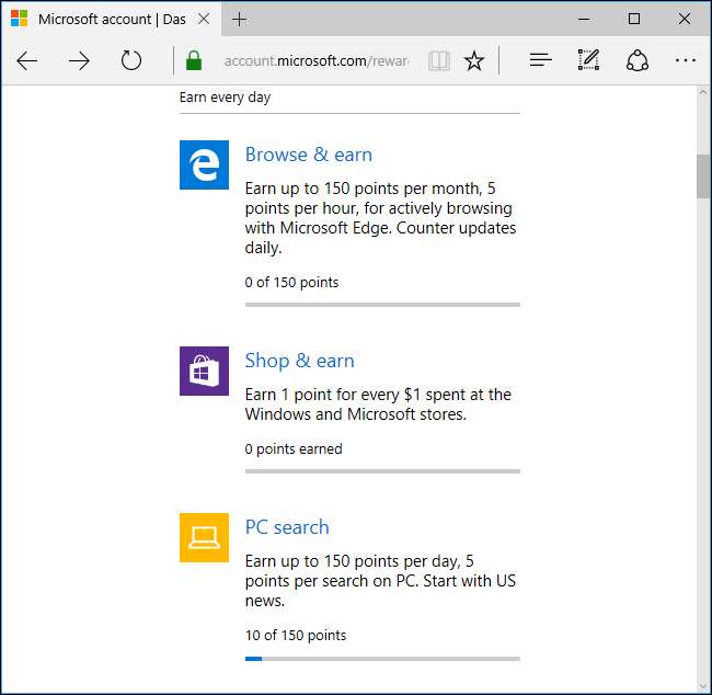 Ansaitaksesi pisteitä Edgen käytöstä sinun on käytettävä Microsoft Edge -selainta Windows 10: ssä ja kirjauduttava Windowsiin samalla Microsoft-tilillä, jota käytät Rewards-ohjelmassa. Microsoft selittää miten Edgen käyttäminen palkitsee .